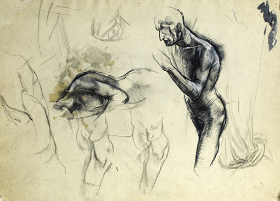 Almost no work survives from Sorrell’s period as an RCA student other than the preparatory drawings with which he competed for his 1928 Rome Scholarship. The RCA archives for this period are much depleted (probably having been destroyed in the war), as a result of which it is hard to gain a fuller picture of this formative period of his life. An equally small body of work has survived from his two years in Rome though his early self-portrait (November 1928) ‘ a masterly fusion of nagging self-doubt and youthful self confidence ‘ hints at the emerging power of his talent. Sorrell recorded his time at the British School at Rome in an unpublished typescript titled Barbarians in Rome in which he paints a vivid picture of life at the school during the years 1928-30.