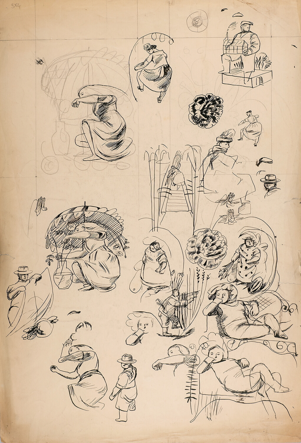 Sketches of men and women involved in various activities, of unknown purpose or destination