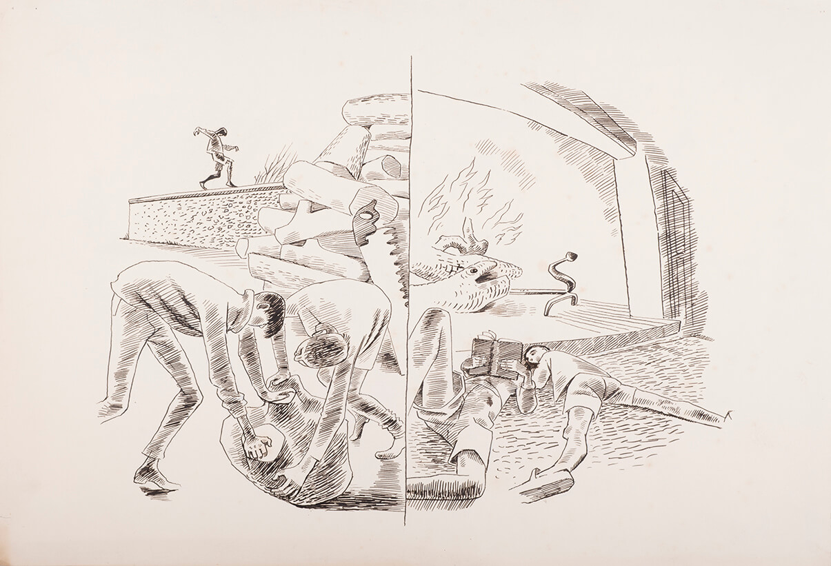 This sketch for what turned out to be the last of Dunbar’s and Roger Folley’s Christmas cards (she died the following year) features side-by-side activities of collecting and cutting firewood (L) enabling them to relax (R) at the fireside at Staple Farm, Dunbar’s and Folley’s house near Hastingleigh, Kent. Modelling for the figures are two boys she and Roger Folley occasionally welcomed from the Caldecott Community, a nearby children’s home, and Richard, the younger of their two nephews.