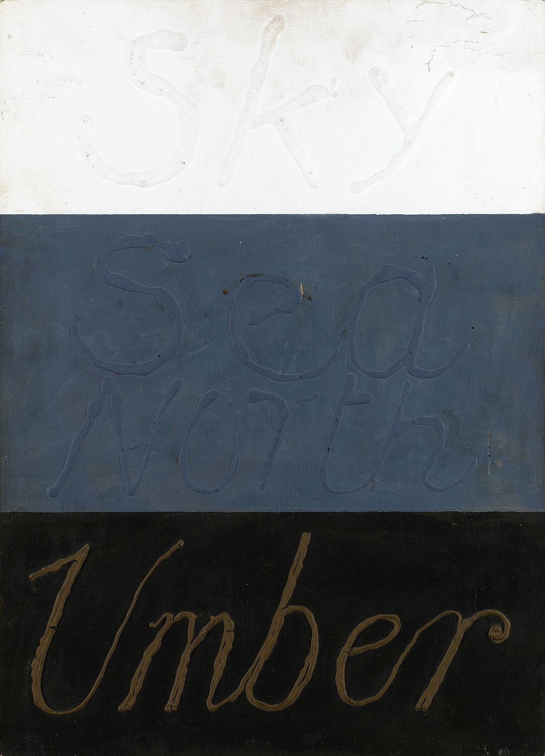 In retirement, Rowntree found a new studio in Beaufort village, a few miles from his house in Northumberland…. Rowntree remained inventive…. Relief lettering formed the succinct verbal/visual landscape Sky Sea North Umber, depicting a coastal scene through four words and four bands of colour (one of them raw umber) reusing the fragment Umber with North to suggest Northumberland.
