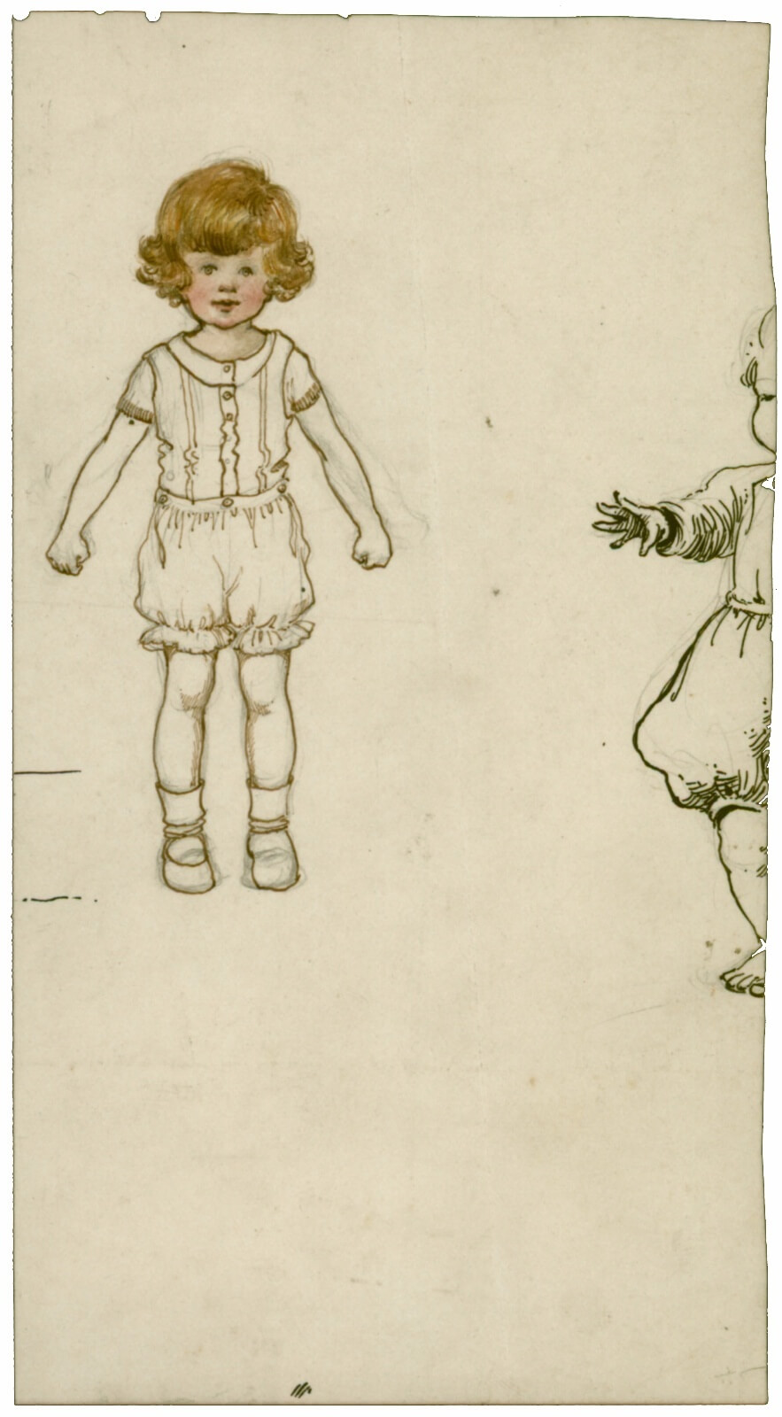 This small girl is probably a study for an illustration for one of the short stories for children, often featuring similar winsome, doll-like little girls, which Dunbar wrote and illustrated in the year after she left school.