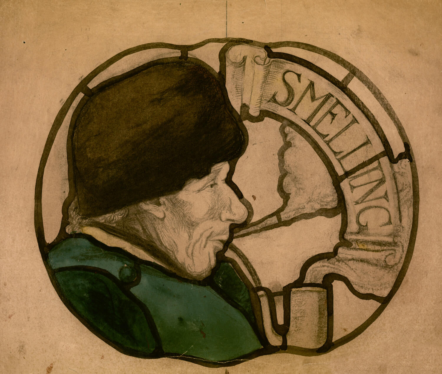 One of the Five Senses,Smelling might have been intended to ornament a secular building such as an Inn. The design might be related to the The Black Friar Pub. 174 Queen Victoria Street, London EC4, with its Interior designed by Herbert Fuller-Clark (b.1869, d. after 1912). The original building was constructed in 1875. and subsequently remodeled in several stages beginning 1903, 1914, and 1925, with decorative elements undertaken by by Nathaniel Hitch, Frederick Callcott, Henry Poole, and Farmer and Brindley.