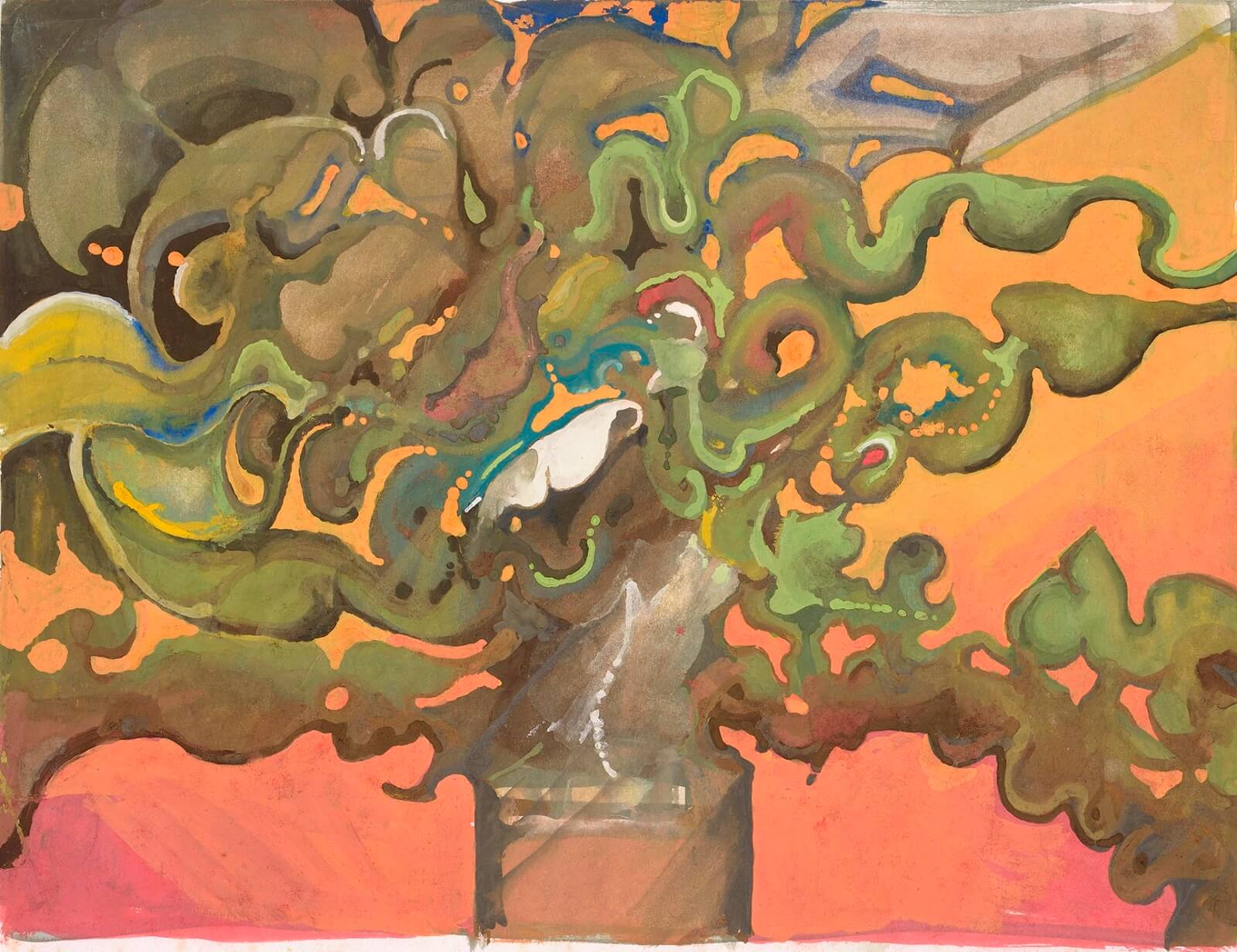 Evans’ strikingly large watercolours (they typically measure over one metre in height or breadth), span two decades, (from the late 1960s to the late 1980s). While powerfully evoking the period charm of the glam-rock era, Evans showed a conscious awareness of the shifting political landscape around him. His compositions are characterised by a kaleidoscopic vision of Thatcher’s Britain: an era of urban redevelopment, the Falklands War, industrial unrest, nuclear power, and the Cold War. Transition is everywhere: new roads carve their way through the countryside; fighter jets cast their shadows across the landscape; the scars left by industrial plants, pylons and landfill permeate throughout.