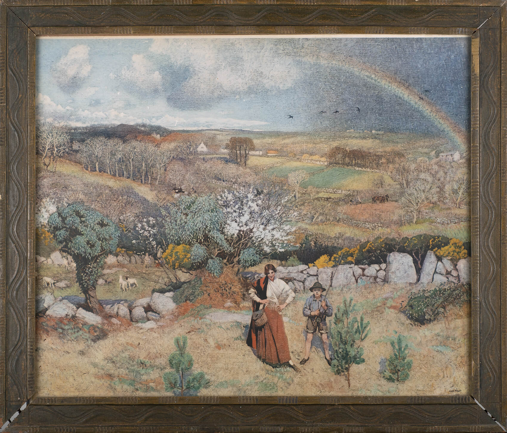 The artist wrote (loc. cit.) that the idea of this picture goes back to the period of the Boer War, when she was staying in Staithes in Yorkshire. She described her first view of primroses in the valley called Pearly Bottom and her first desire to paint landscape: I went there many times, hoping to make studies for a great work. There was to be everything that I know of spring in that big picture. All I learned there was the origin of a work called Spring painted in Cornwall years later. The picture was actually begun early in 1916, the scene was Lamorna Valley and the models were Ella and Charles Napier. In a letter (15 November 1957) she wrote: This picture was painted during the World’s War No. I. At that time it was against the law to paint out of doors anywhere near the Cornish Coast. And to get the material I needed, here and there, I had to lie on my stomach under a gorse or any other convenient bush, in dread of being taken off to prison, to make a line or two in a sketch book, memorise – rush back into my studio, and paint. It was exhibited with the original man in it. … For some reason or other I changed the original and put a boy in instead of the man who now figures again in the work, and the copyright with the boy in was bought by the Medici Society, whose recent reproductions of the picture imply a brownish painting, which it never was. I had this picture, which traveled round to many exhibitions, both in England and abroad, for many years, and finally decided that I had made a mistake in changing the age of the male figure, I gave the boy the boot and put back the man. … While exhibited in the International Exhibition at Pittsburgh sometime between the 2 World Wars, it was badly injured (in colour) by the terrible acidity of that smoky atmosphere caused by the immense area nearby of Carnegie Steel Works. I had a terrible business in taking off the varnish to save it – and had to do some repainting. It was then I put the man back in his place. … And I do hope it may have again the title I gave it. I hate a title that localises a picture – just a view. Why not have a photograph if that’s what is wanted. The picture was previously catalogued as Spring in Cornwall.