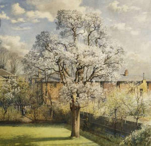 Bush and the artist Noel Laura Nisbet (1887‚Äì1956), whom he married in 1910,  live in the same semi-detached house in Queensland Avenue, Merton (a gift from Noel’s father) from 1914 until their deaths, but while Noel’s work featured imagined scenes (often for book illustrations), over the years Harry regularly depicted the suburban back gardens seen from his studio. He also painted landscapes, portraits and still life studies, but is best known as the painter of suburbia’. In truth, though, he remains largely unknown today: the inclusions of his 1923 painting A February Afternoon and 1940 painting A Corner of Merton, 16 August 1940 in the Tate Britain’s 2004 exhibition Art of the Garden was a rare ‚Äì and fully deserved ‚Äì recognition.