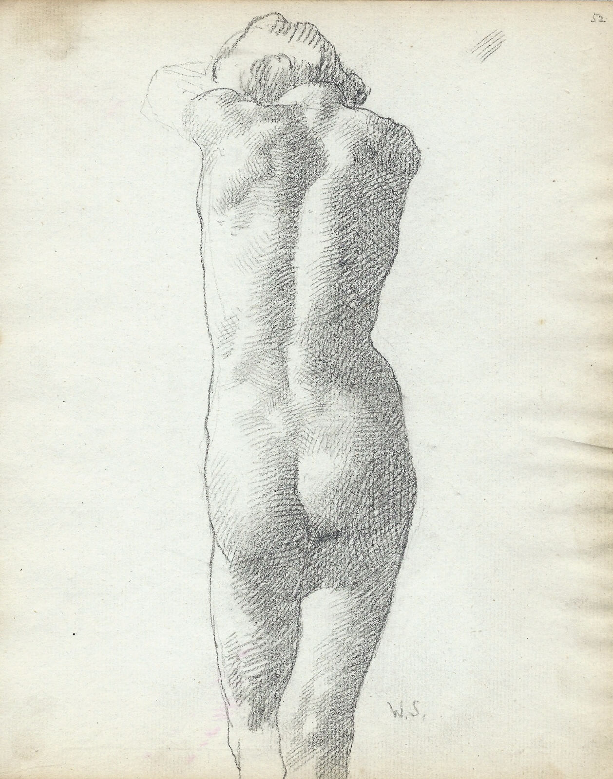 At the Slade Strang studied for 6 years under Alphonse Legros, Slade Professor from 1876 to 1883, an early champion of the metal-point revival. Strang became assistant master in the etching class and one of the principal practitioners of the demanding medium of metal-point during its short-lived revival in the late 19th and early 20th centuries (until this time it had hardly been used since the early 16th century). He exploited metal-point’s capacity to express romanticised prettiness in soft, silvery tones. Technically brilliant, Strang drew aa he engraved creating areas of tonality through a system of parallel lines, hatching and cross hatching.