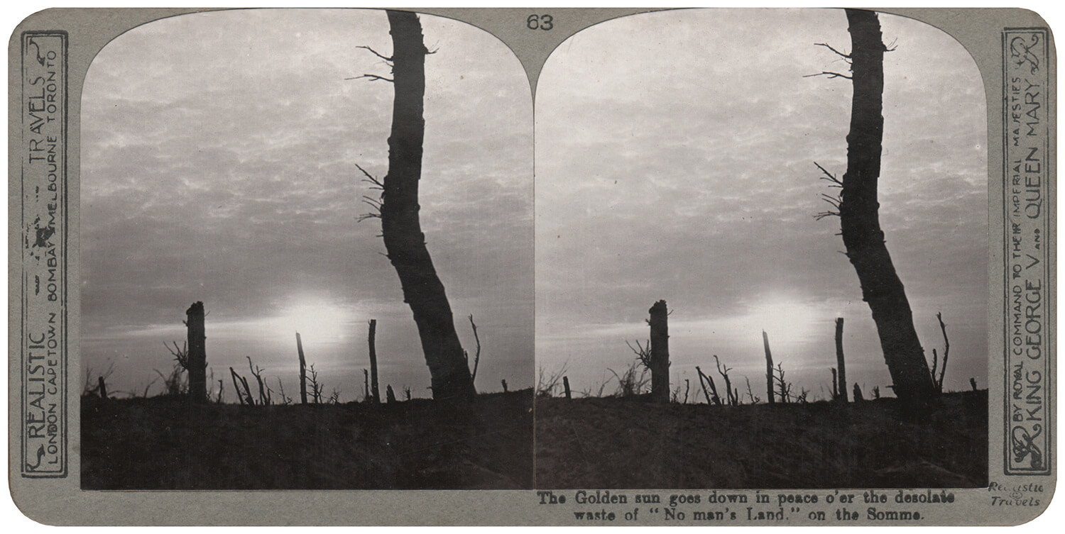 Stereoscopic print: The Golden sun goes down in peace o’er the desolate waste of “No man’s Land” on the Somme.