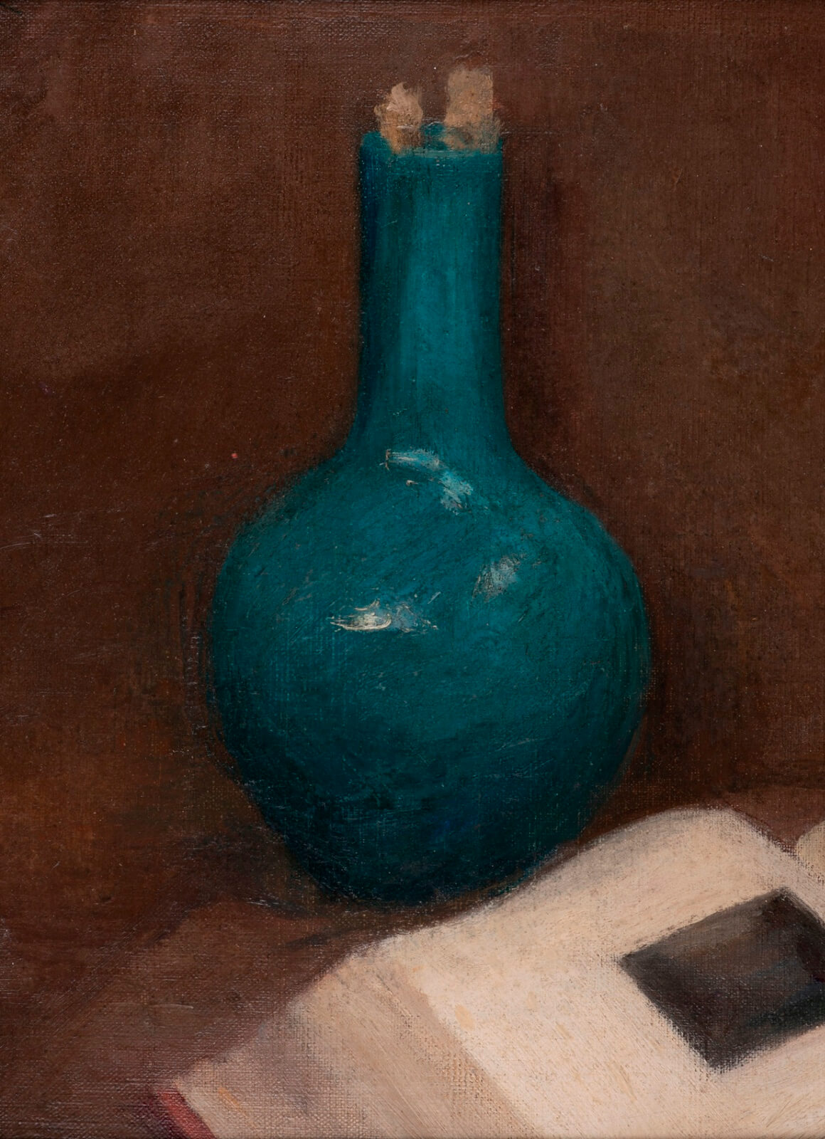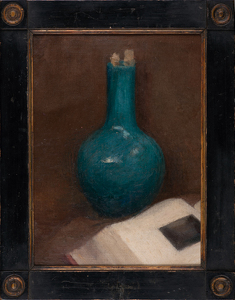 Still life of a blue vase with an open book, circa 1885