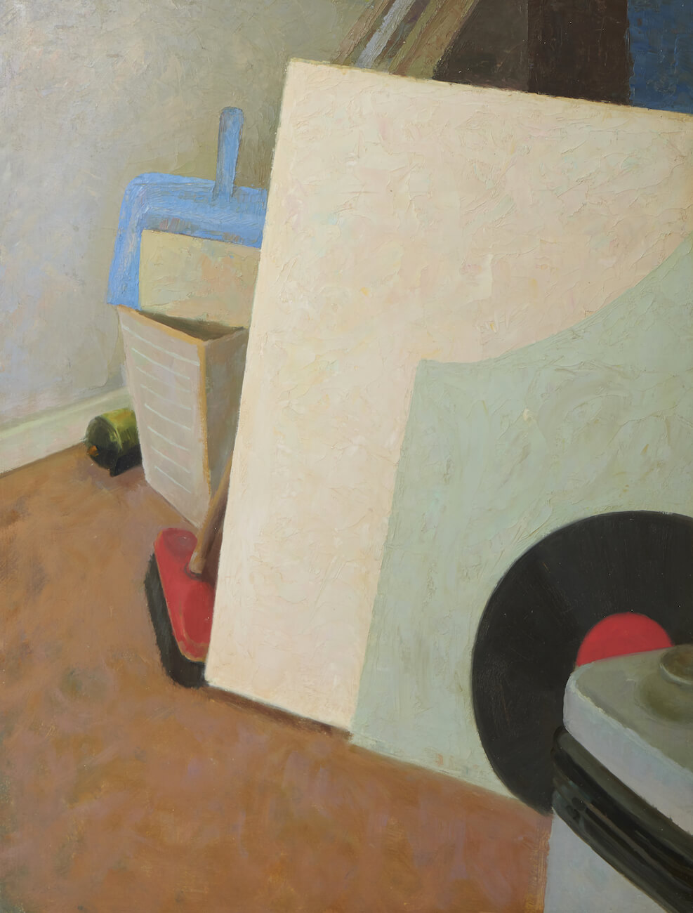 Piled into a corner the  mundane apparatus of the artist’s domestic routine ‚Äì a broom, dustpan and brush and basket are discernable  – combine to form an attractive semi abstract composition.