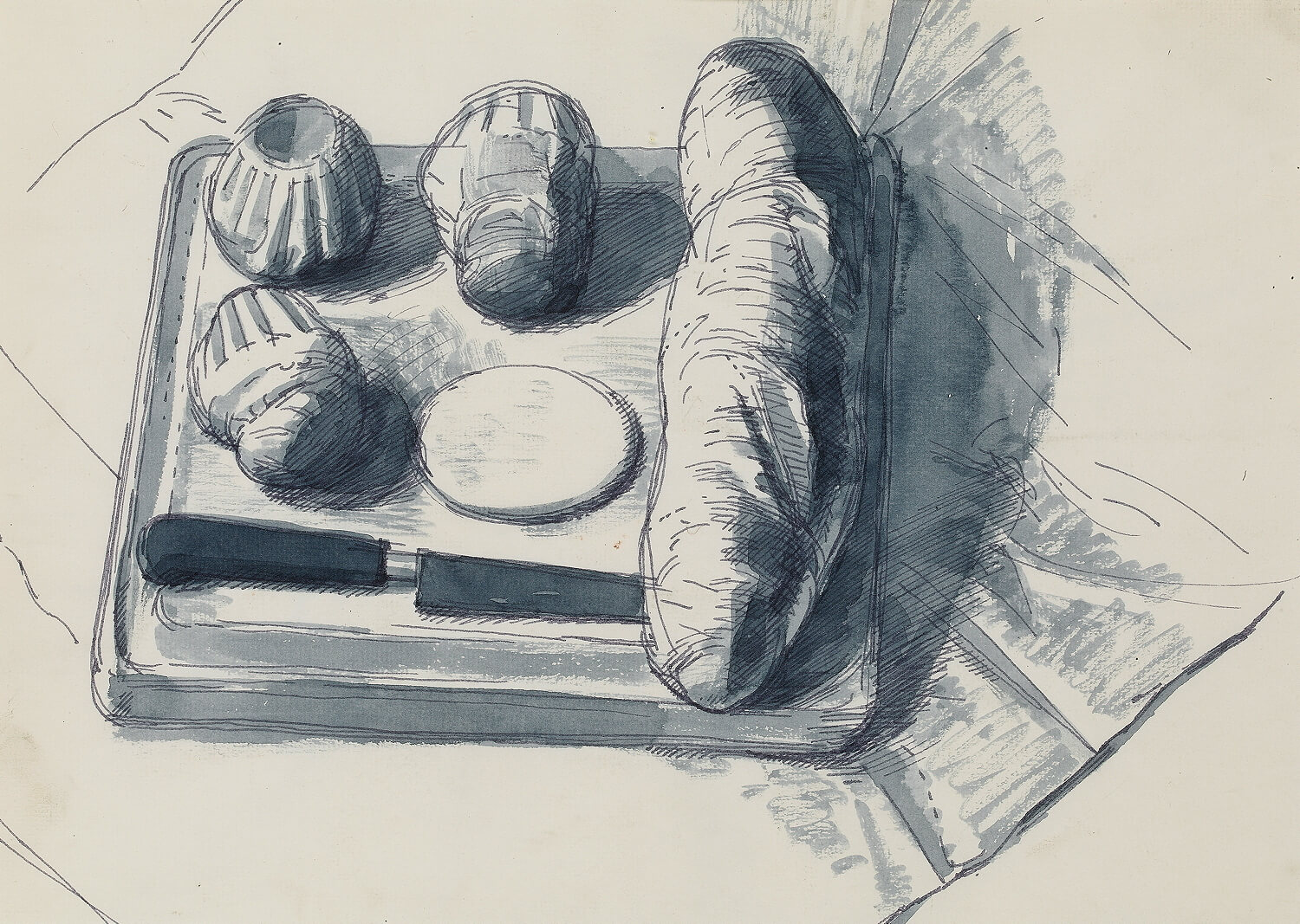Still life of bread, brioche and a knife, circa 1935