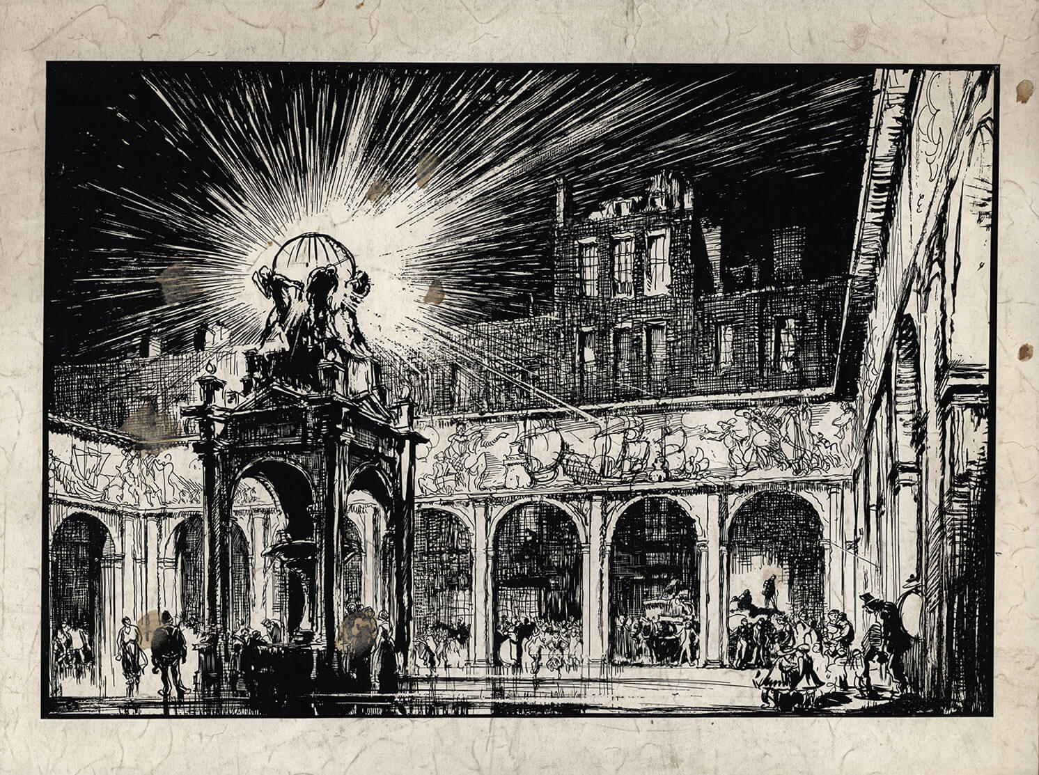 ‘Street Decoration’ was a proposal for a Drake Memorial, sketched in 1912.  It was never carried out, partly because of the scale (it included the colonnade and maritime frieze as well as a monument topped with an illuminated crystal globe), and partly because the proposed location was the deprived East End.  It’s reproduced in Furst’s Decorative Art of FB, and Furst writes about it pp.185-6.