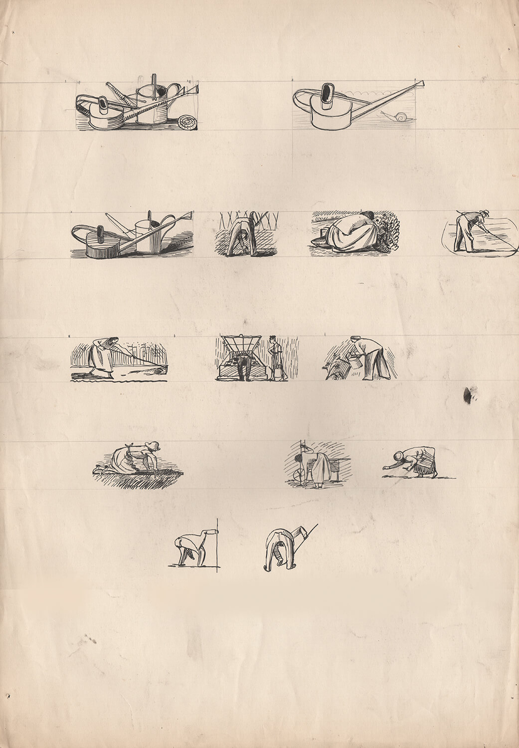 gardeners – male and female. There were only a dozen vignettes of these toiling figures and the delightful sheet of studies (CAT 60) shows several of them in embryonic form, most particularly the rear view of one of the Dunbar’s gardeners bent double with rake or hoe in hand.