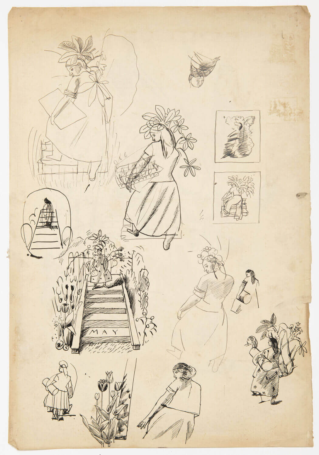 Sketches of men and women involved in various activities, of unknown purpose or destination