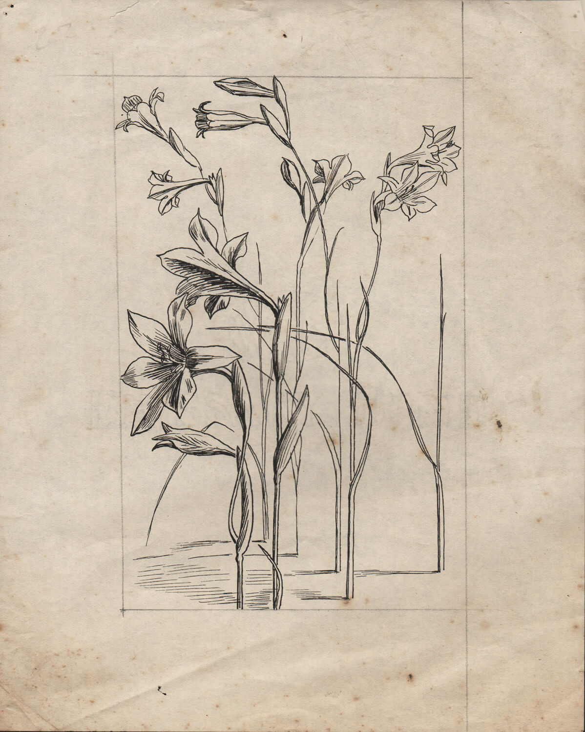 Looking at the ten studies of Gladiolus tristis presented here (CAT 46-55) it is instructive to note how obsessively Dunbar drew and redrew each plate to achieve the clarity and precision she and Mahoney were seeking. It is also interesting to realise that, despite such claims in Community of Plants’ (p.7) as: With one of us Hieraceum aurantiacum… has behaved most meekly for years… With the other it has shown signs of becoming a menace to a small garden’, Mahoney did not have a garden of his own until he and his brother bought Oak Cottage at Wrotham in 1937, the year Gardeners’ Choice was published. It is possible that he grew some plants in his mother’s small back garden at Anerley on the Kentish-London border but most of the plants discussed were probably grown at The Cedars, and in the sheet of sketches (CAT 56-58) we get several vignettes of Mahoney seated in the garden there drawing diligently..”