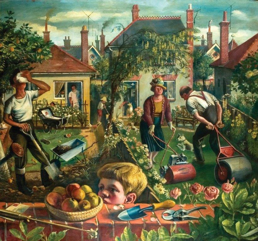 Another aspect of Sorrell’s oeuvre which deserves greater recognition are the paintings he produced during WW2. Like many artists of the period, such as Sir Thomas Monnington, Sorrell’s direct experience as an airman resulted in a new perspective ‘ broad horizons and tilted aerial views which were to become the hallmark of his post-war reconstruction drawings. Never an Official War Artist he was able to choose his subjects with relative freedom which resulted in an engaging record of daily life in wartime Britain.
