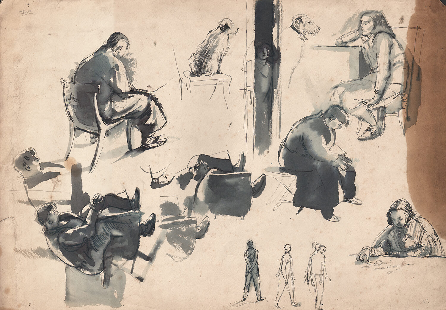 This sheet includes studies of the artist’s sisters Marjorie (with head on hand), Jessie (playing patience) and Felbridge (the dog) sitting on a chair, etc.