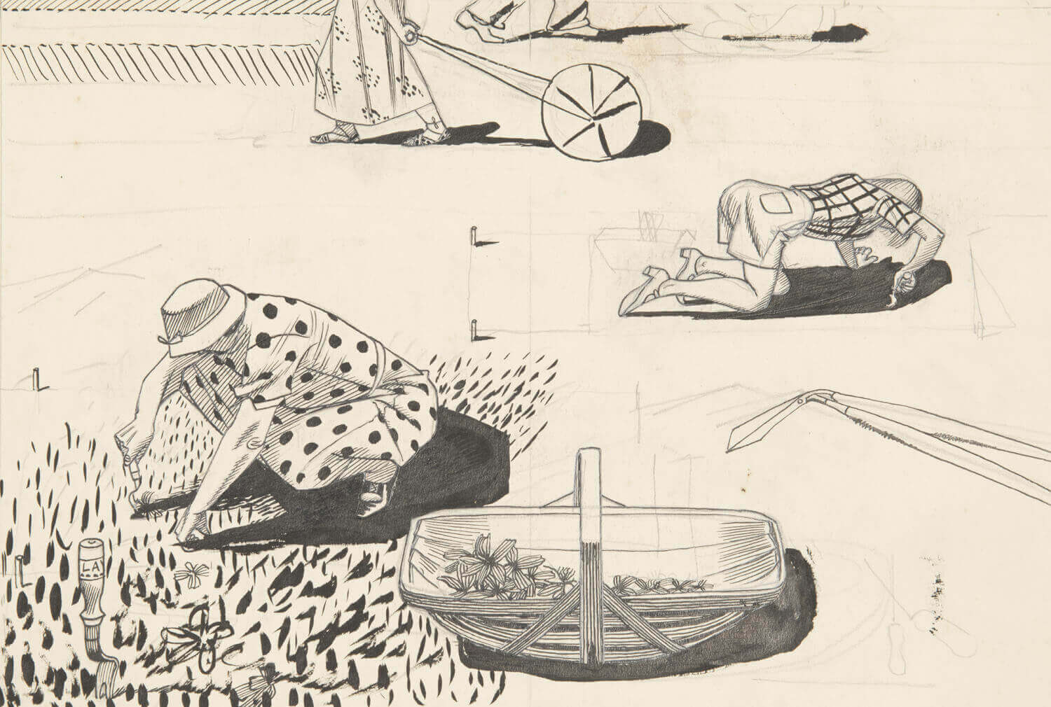 Noel Carrington, Dunbar’s Hampstead landlord, was keen to promote the work of those artists he admired. In 1937 as editor at Country Life Ltd he commissioned Ravilious to illustrate ‘The Country Life Cooke- ry Book’ and Edward Bawden ‘The Gardener’s Diary’. These were fol- lowed in 1938 by the now celebrated ‘High Street’, again illustrated by Ravilious, and a further ‘Gardener’s Diary’ illustrated by Evelyn Dun- bar. Each month was illustrated by its personification – some were later worked up into oils – while depictions of gardeners, male and fe- male, and their activities served as vignettes and tailpieces. Dunbar took the opportunity through a studied awkwardness to emphasise the fact that physical labour is the gardener’s lot throughout the year.