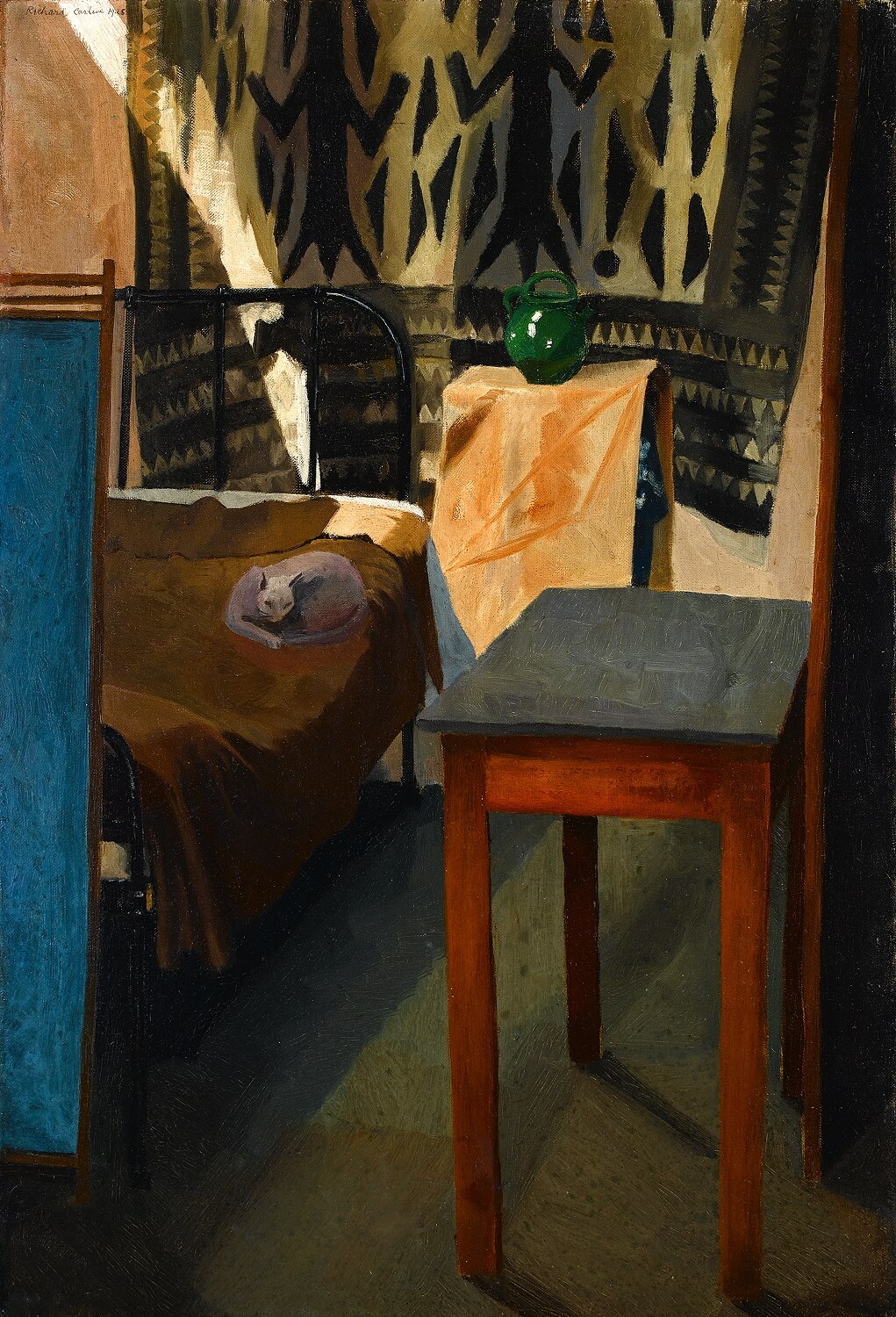 Painter, writer and administrator, Carline was born in Oxford. His father, George Carline, his mother, Anne, and brother Sydney, his sister Hilda (Mrs Stanley Spencer) and his wife, Nancy, were all painters. Carline in 1913 attended Percyval Tudor-Hart’s Academie de Peinture, in Paris. After a short period teaching, Carline served in World War I and was appointed an Official War Artist. With his brother he became noted for war pictures from the air. He was elected LG in 1920, at which time the Carlines’ Hampstead home became a centre for artists such as Henry Lamb, John Nash and Mark Gertler. During this period Carline was clearly influenced by Stanley Spencer, transforming everyday scenes into something monumental. Carline achieved this, however, without exaggerating form or gestures to the degree that Spencer did. Between 1924 and 1929 Carline taught at the Ruskin School of Drawing, Oxford. He had his first solo show at Goupil Gallery in 1931. The mid-1930s saw Carline involved in Negro art, organising a show at Adams Gallery in 1935, and contributing the main text to Arts of West Africa, edited by Michael Sadler. During World War II Carline supervised camouflage of factories and airfields. He was involved in AIA, helping to found the Hampstead Artists’ Council in 1944. In 1946-47 he was appointed as the first Art Counsellor to UNESCO, and from 1955 to 1974 was chief examiner in art for the Cambridge Local Examinations Syndicate. His books include Pictures in the Post: the Story of the Picture Postcard, 1959; Draw They Must, 1968; and Stanley Spencer at War, 1978.