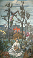 Although not specifically related to the Festival of Britain commission, Autumn was produced during the same period as The Garden and but for a slight difference in height could be described as its pair. The artist’s wife, Dorothy, posed for the main figure. The formal qualities of the Victorian red brick house – which was visible from the platform at Borough Green Station – held a fascination for Mahoney. He frequently travelled from the station to London during the period that he taught at the Royal College of Art.
