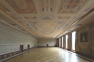The New Bristol Council House, designed by Vincent Harris, was built in the early 1950s. Monnington was commissioned to paint the ceiling in1953; it was unveiled in 1956. The ceiling, measuring 95 x 45 feet (over 4000 square feet), is amongst the largest post-war decorative schemes in Europe. Monnington insisted on painting in the Renaissance manner – directly onto wet plaster. The colours were ground and mixed with an emulsion of eggs, chalk and water – Bristol’s Clerk of the Works delivered baskets of eggs daily.