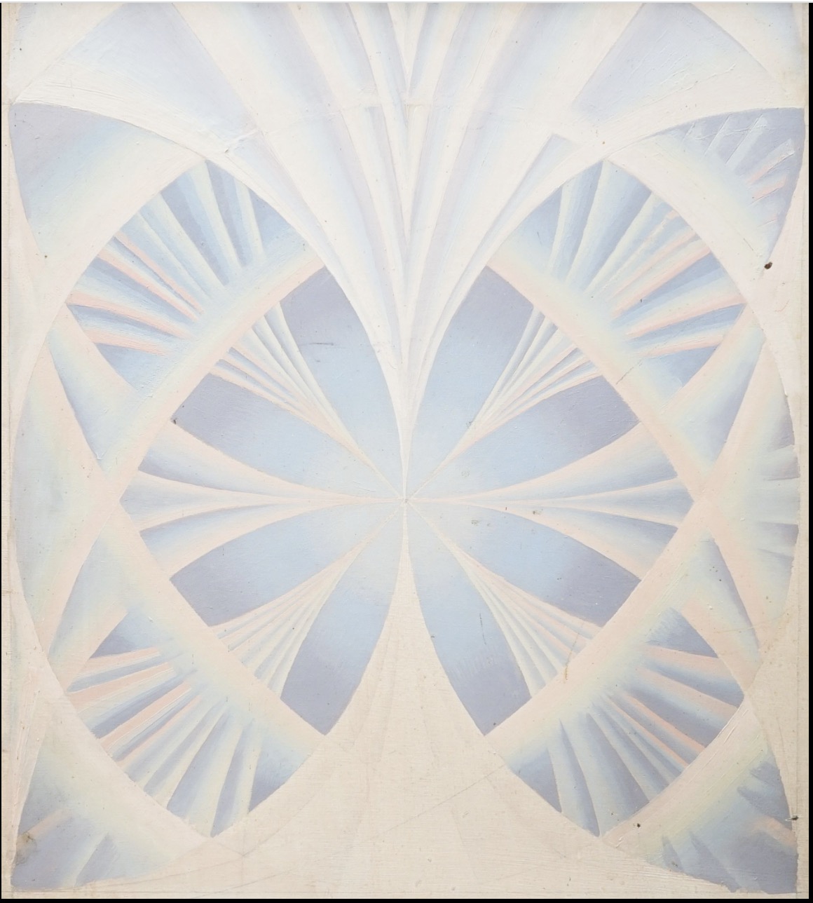 Monnington’s design bears similarities to the paintings of the Italianfuturist Balla, but is underwritten by his deep admiration for Piero della Francesca, constructed as it is along the lines of the Golden Section. There are also stylistic similarities with the sculptures of Monnington’s neighbour, Professor Gerrard. A number of drawings by Monnington for the ceiling are in the collection of the Victoria and Albert Museum, The Science Museum and Bristol City Art Gallery. This important preparatory tempera study is one of two made by Monnington, the second of which is in a private collection (London).