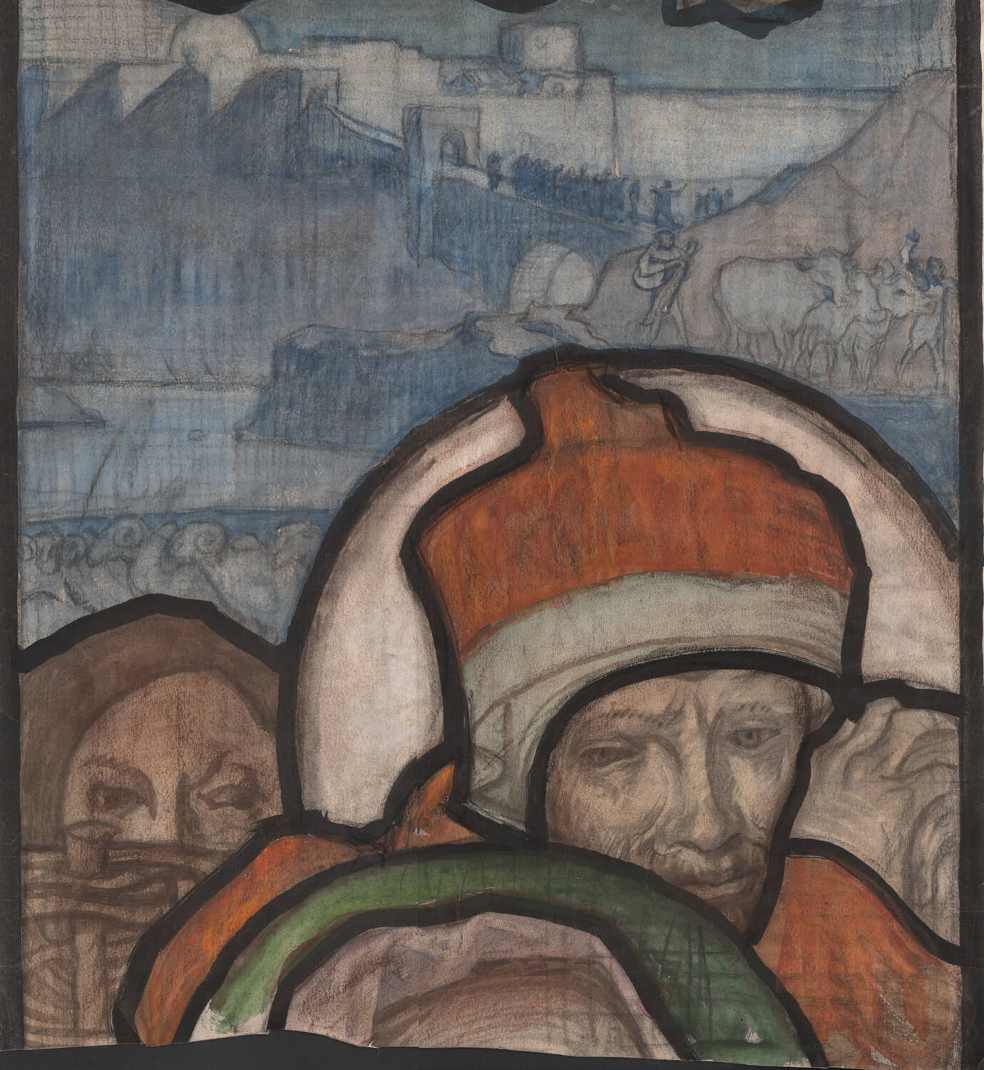 One of Brangwyn’s most important stained-glass commissions, and probably his most successful, this design for a stained-glass window was commissioned by Lady Webley-Parry-Pryse in memory of her mother, Mrs Webley-Parry, who had died on 2 September 1917. Mrs Webley-Parry had given very generously of her time and money in parish affairs. The three-light window is situated in the north aisle of the Church of St. Mary the Virgin, Bucklebury, and shows a landscape nativity scene with Mary, Joseph and the infant Jesus in the centre, shepherds to the right and left. Behind the figures a wattle fence creates a horizontal divide over which the spectators gaze and beyond this a blue-grey landscape with sheep, cattle and Bethlehem in the distance. The stable roof appears at the top, the vertical stable supports dividing the outer lights. The design was executed in glass by James Sylvester Sparrow.