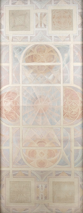 Monnington’s design bears similarities to the paintings of the Italianfuturist Balla, but is underwritten by his deep admiration for Piero della Francesca, constructed as it is along the lines of the Golden Section. There are also stylistic similarities with the sculptures of Monnington’s neighbour, Professor Gerrard. A number of drawings by Monnington for the ceiling are in the collection of the Victoria and Albert Museum, The Science Museum and Bristol City Art Gallery. This important preparatory tempera study is one of two made by Monnington, the second of which is in a private collection (London).