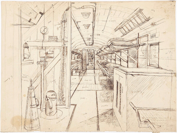 In 1941 Dunbar was commissioned by the War Artists’ Advisory Committee to record hospital trains. Intended to provide emergency evacuation transport for victims of gas or bombing attacks, chiefly in London, they consisted of converted passenger carriages and – as in this sketch – guards’ vans. Dunbar’s sketch contains colour notes and observations in pencil. Human figures were later added to create Hospital Train, 1942, now in the collection of the Imperial War Museum.