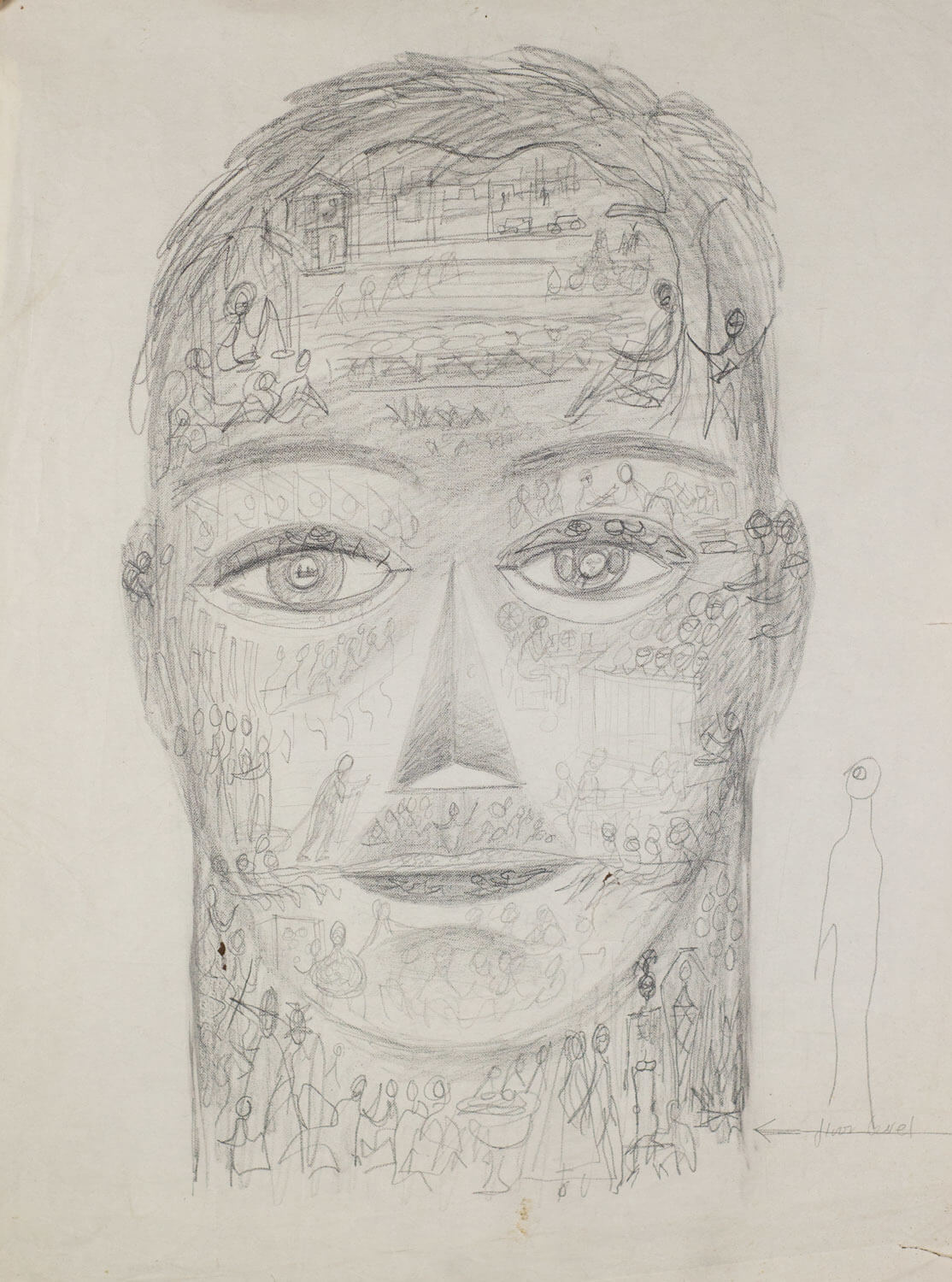 The two most impressive murals Barbara Jones produced were of gigantic heads, the first commissioned by the Central Office of Information for an International Labour Office exhibition in Turin celebrating the centenary of the Italian State (1961), the other for Philips Research Laboratory in Eindhoven (1966). These were not only striking because of their size but because of the way Jones chose to interpret her briefs. The Philips’ mural, entitled Man and his Senses, is a relatively straightforward strong image, with enlargened fingertips, mouth, nose, eyes and ears filled with patterned neurons and synapses, only weakened by the somewhat sentimental placing of a rose outside the head.
