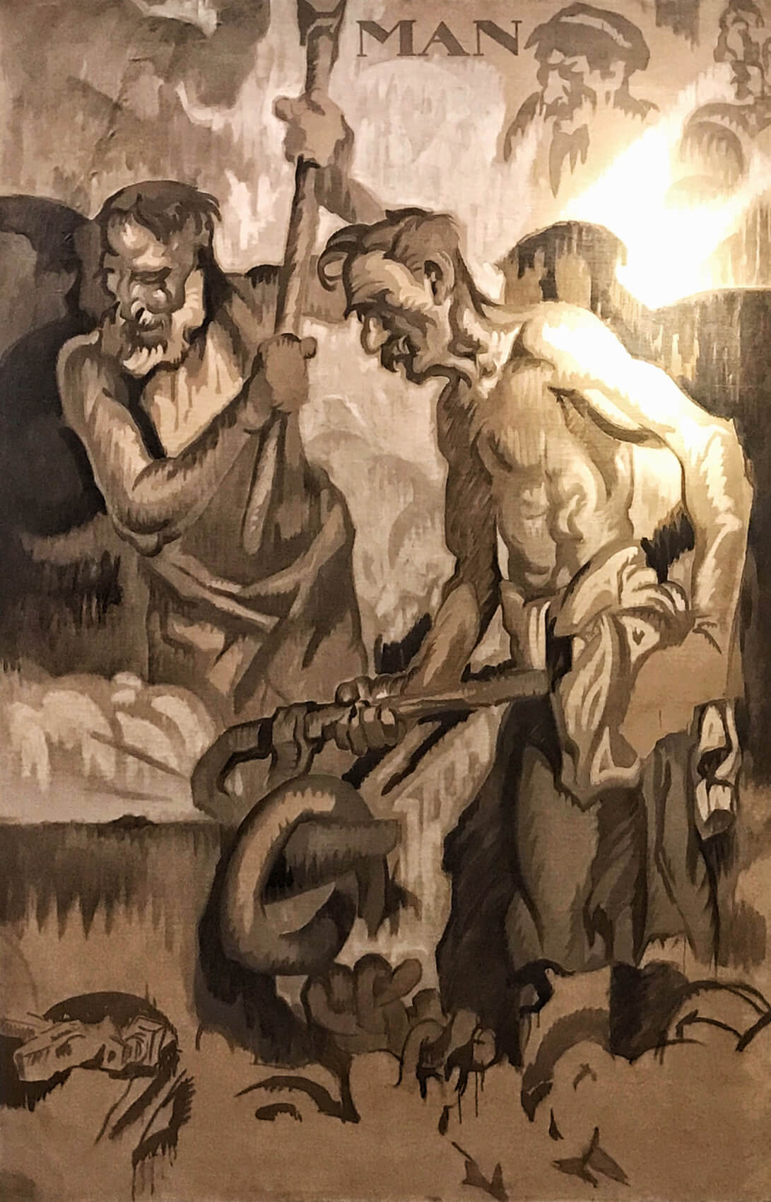 J. D. Rockefeller Jr. had originally approached Pablo Picasso (1881-1973) and Henri Matisse (1869-1964), but both artists turned the commission down. Brangwyn, Josep Maria Sert i Badia (1874-1945) and Diego Rivera (1886-1957) were subsequently appointed to carry out the scheme. The three artists were briefed to work on canvas, (of which no more than 75% was to be covered), to paint en grisaille and to include some lettering in their designs. The broad subject matter of the murals was ‘New Frontiers’, encompassing aspects of a modern society, including science, labor, education, travel, finance and spirituality. Brangwyn was assigned four themes expressing man’s search for eternal truth: Man Laboring; Man the Creator; Man the Master; Man’s Ultimate Destiny.Â