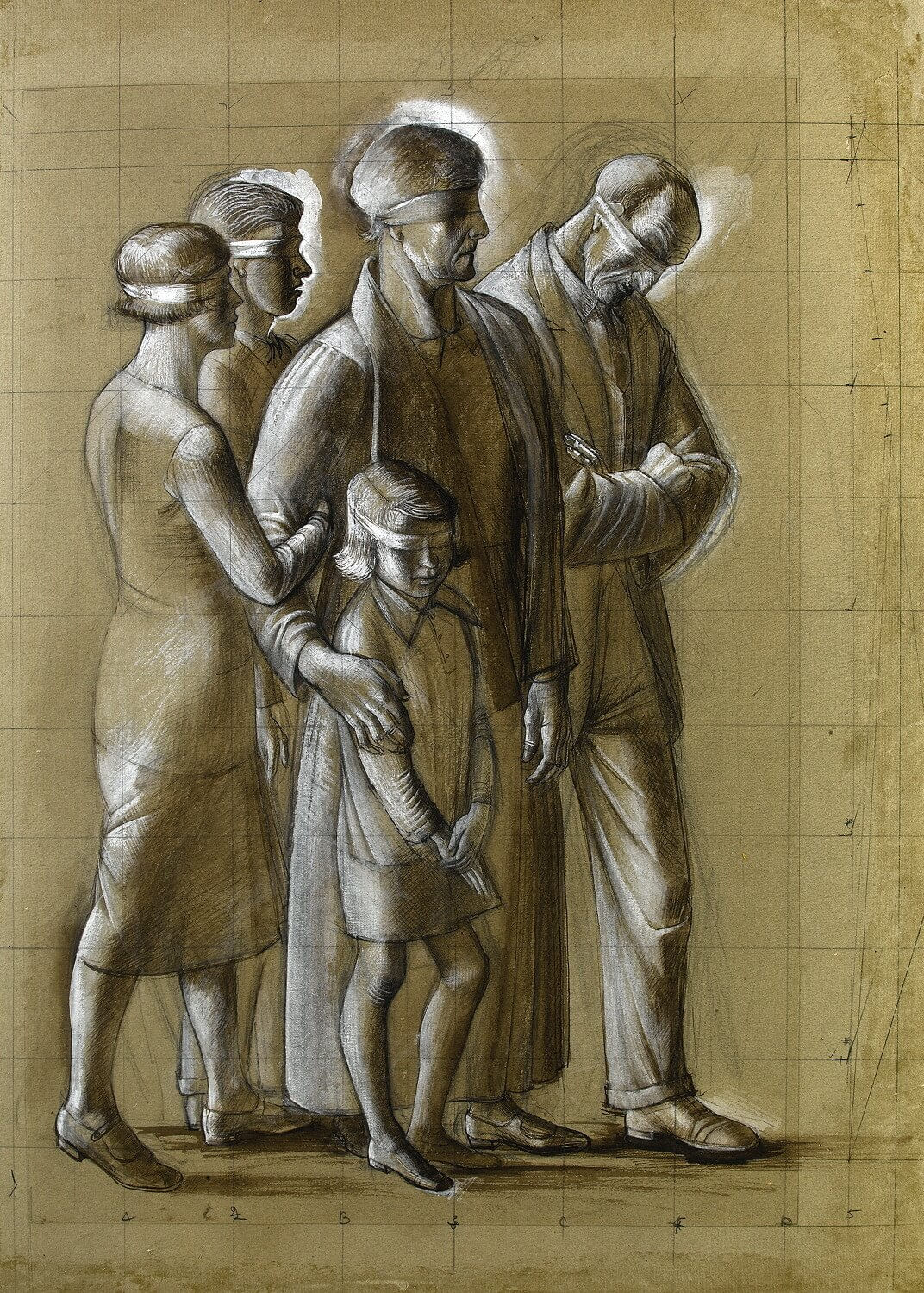 Sorrell chose as his subject People Seeking after Wisdom. While the Bible contains many references to the attainment of knowledge as a pre-requisite of enlightenment, the motif of blindfolded figures is equally reminiscent of the harrowing images of bandaged soldiers from the Great War, such as John Singer Sargent’s Gassed, 1919.