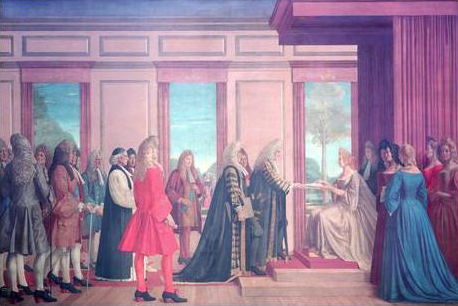 The English and Scottish commissioners present articles of agreement for the Parliamentary Union of the two countries to Queen Anne at St Jame’s Palace in July 1707 was one of eight subjects set by Sir Henry Newbolt for the decorative scheme of history paintings in St. Stephen’s Hall in the Palace of Westminster. The paintings, by eight artists working as a team under a Master Painter, Sir David Young Cameron, were executed in matt oil colours in marble medium. Orpen was originally scheduled to paint this subject but dropped out. Cameron invited Monnington, then aged 23, to tackle it instead. Monnington was the youngest of the team by ten years and his inclusion – despite grumblings from Rothenstein about giving important wall space to untried youngsters, (William Rothenstein, Since Fifty, 1939, p 25), is evidence of his prodigious early reputation.