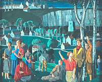 Painter, notably in tempera, especially of Derbyshire. Born in Sheffield, Allen attended King Edward VII School for boys, and then became a clerk in the steel works of Arthur Balfour, in his spare time attending Sheffield Technical School of Art. He served in the army in World War I, gaining the Military Medal for conspicuous gallantry. Although badly injured and having an artificial leg, Allen continued to paint and became Balfour’s confidential secretary. From 1931 he painted full-time and joined the new Yorkshire Group of Artists. He began exhibiting at the RA, and showed with RBSA and PS. He also travelled in Ireland and was elected a member of the RBA in 1935. Although Allen’s early work is conventionally realistic he soon developed his distinctive style of simplified landscape and figure studies, which eventually were shown abroad in Canada and America. In the early 1940s Allen published a series of articles in The Artist on landscape painting in which he expounded his approach. His work is in a number of public galleries, notably Sheffield, Wakefield, Newcastle upon Tyne, and Newport, as well as in Australia and New Zealand. There was a memorial show at Graves Art Gallery, Sheffield, in 1959 and in 1986. Lived in Ecclesall, Sheffield.