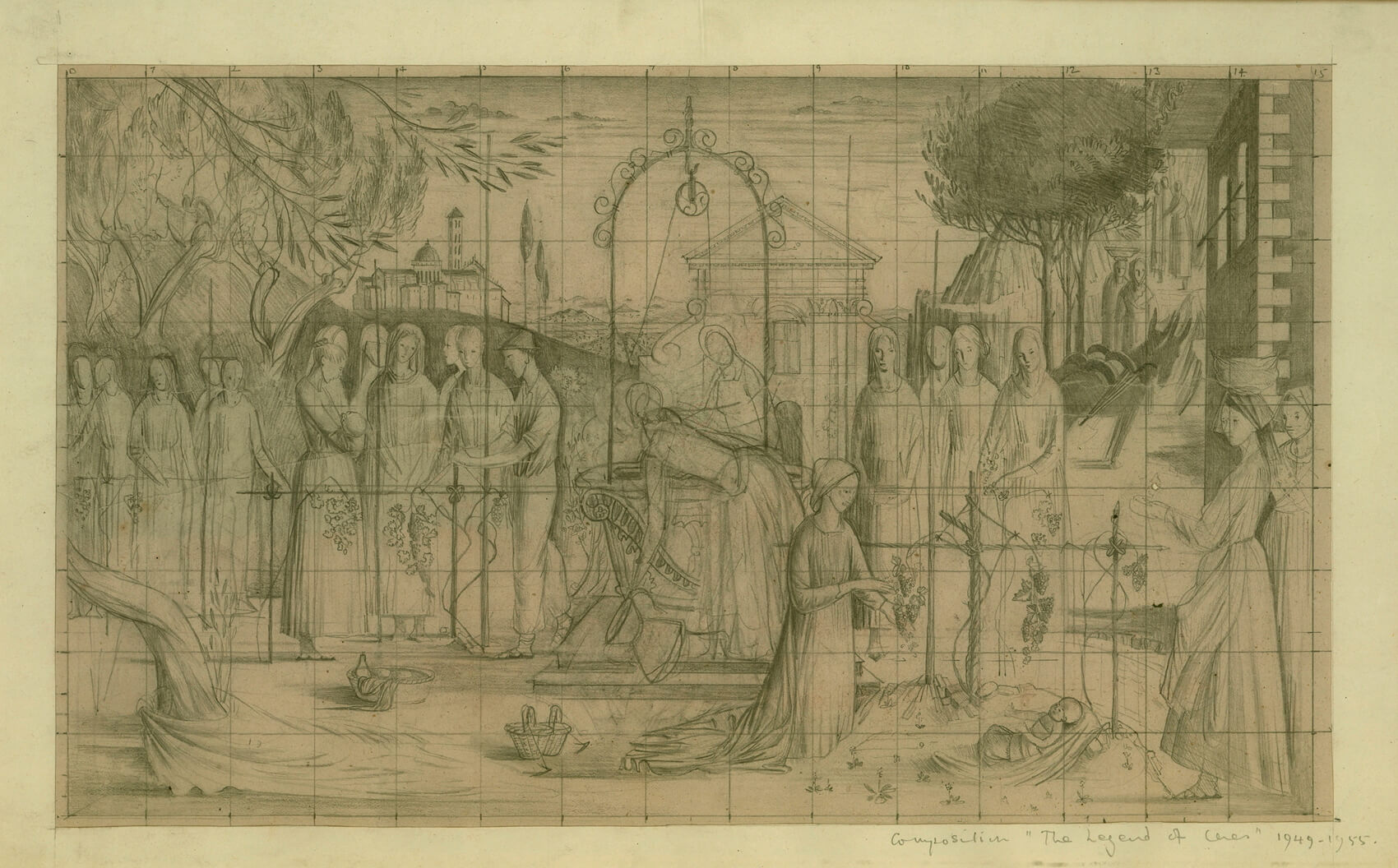 Ceres, according to Ancient Roman myth, was the goddess of agriculture, grain crops, fertility and motherly relationships. Newland returned to the same composition at the end of the decade – a related pencil drawing entitled Composition, The Legend of Ceres is dated 1949 – and in 1950 at the Royal Academy Newland exhibited a variation on the theme, entitled Three Marys, which was loosely inspired by this earlier decorative composition.
