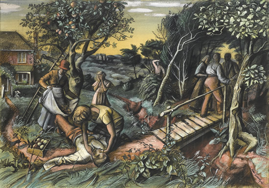 Returning from Rome in 1930, Sorrell produced some very fine works: Artist in the Campagna (c. 1931), Appian Way (1932), Rocky Formation at Thingvellir (1934), The Long Journey (1936), A Land Fit for Heros (1936). Sorrell’s vision was born out of the Romantic British tradition exemplified by Blake, Palmer and their 20th-century disciples.