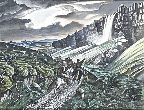 Turkey (1954), Egypt and the Sudan (1962) where he travelled with a specially made canvas bag designed to stop his materials melting in the sun. A latter-day Holman Hunt, and with some of Holman Hunt’s heroism (!), he faithfully recorded scenes in situ including a remarkable series of over sixty drawings of the villages around Nubia threatened by the building of the High Dam at Aswan (1962). In other pictures his journeys were imagined, dramatic fantasies of falling towers, or trains rushing over viaducts.