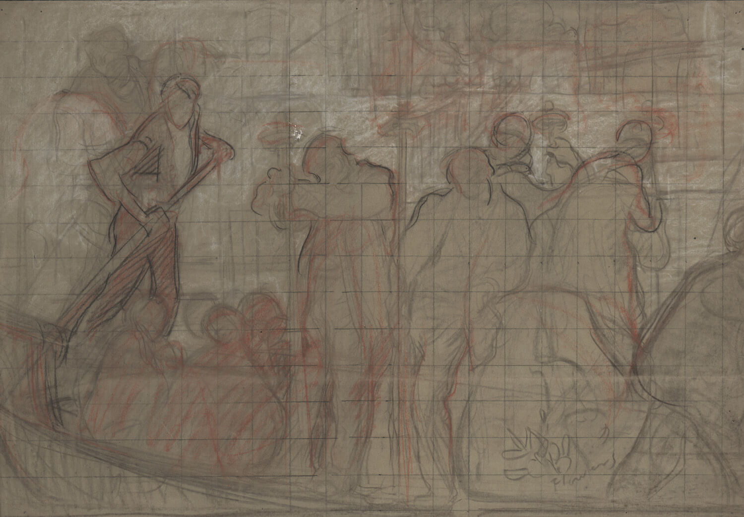 Black, red and white chalk on brown paper, squared in pencil