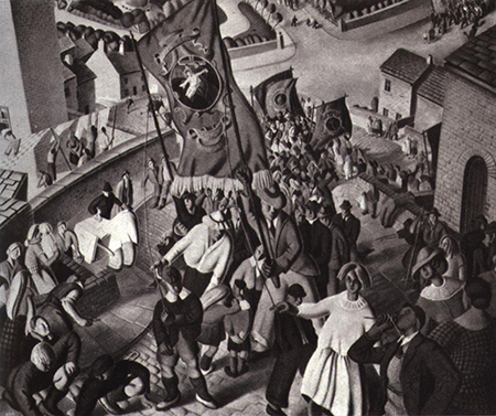 Painter, notably in tempera, especially of Derbyshire. Born in Sheffield, Allen attended King Edward VII School for boys, and then became a clerk in the steel works of Arthur Balfour, in his spare time attending Sheffield Technical School of Art. He served in the army in World War I, gaining the Military Medal for conspicuous gallantry. Although badly injured and having an artificial leg, Allen continued to paint and became Balfour’s confidential secretary. From 1931 he painted full-time and joined the new Yorkshire Group of Artists. He began exhibiting at the RA, and showed with RBSA and PS. He also travelled in Ireland and was elected a member of the RBA in 1935. Although Allen’s early work is conventionally realistic he soon developed his distinctive style of simplified landscape and figure studies, which eventually were shown abroad in Canada and America. In the early 1940s Allen published a series of articles in The Artist on landscape painting in which he expounded his approach. His work is in a number of public galleries, notably Sheffield, Wakefield, Newcastle upon Tyne, and Newport, as well as in Australia and New Zealand. There was a memorial show at Graves Art Gallery, Sheffield, in 1959 and in 1986. Lived in Ecclesall, Sheffield.