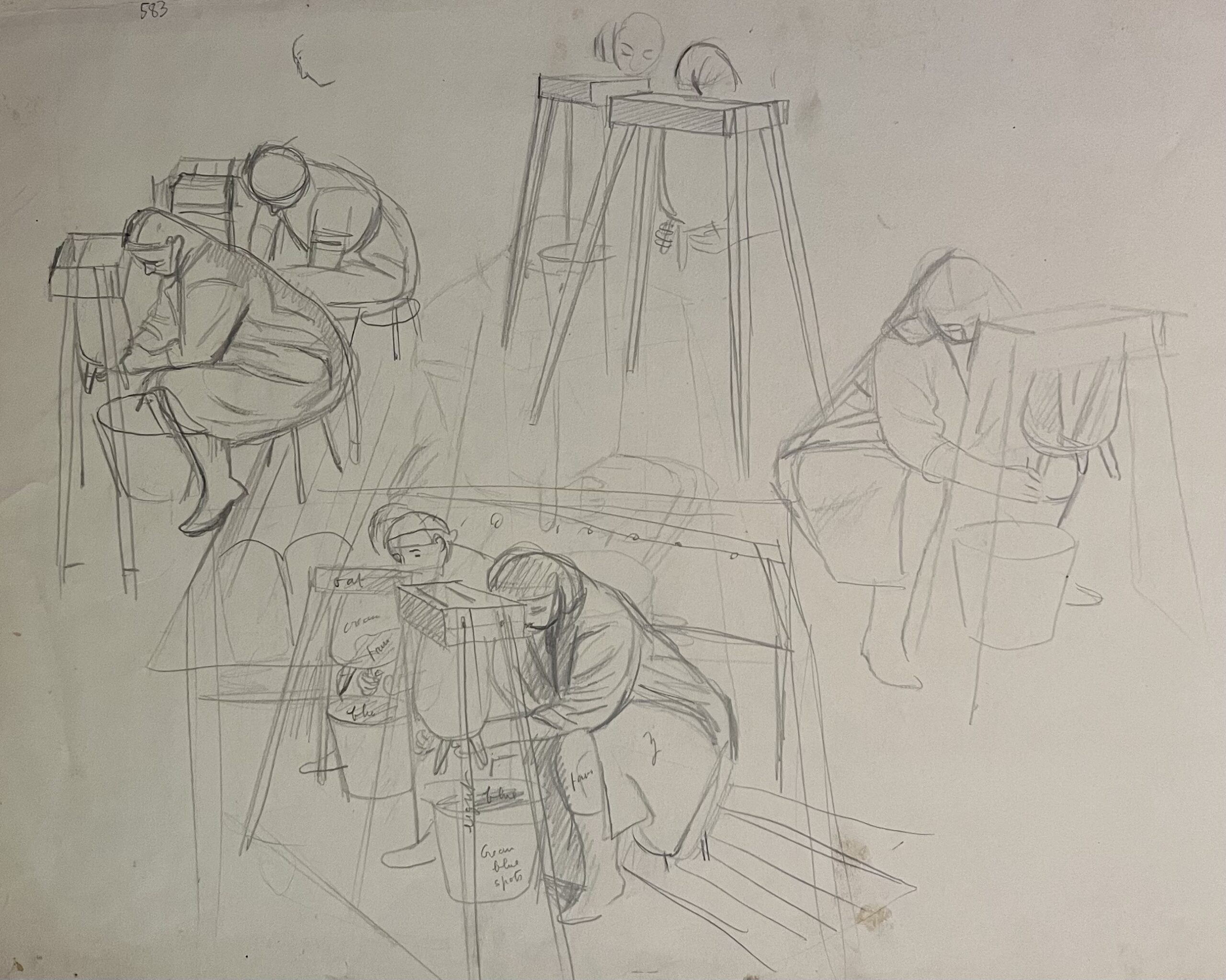 Dunbar’s first major posting as a war artist was to Sparsholt Agricultural College, near Winchester, in May 1940. Sparsholt was a regional centre for the training of the Women’s Land Army recruits, mostly young women aged 18-25. In Dunbar’s sketch they have been issued with bizarre contraptions, canvas bags filled with water, equipped with rubber teats and suspended from a frame, for the teaching of milking cows. Milking Practice with Artificial Udders is now in the Imperial War Museum, London.