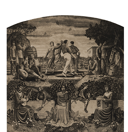wall at the back of the stage used for orchestral concerts, dramatic performances and folk dancing. In the foreground were seven Muses: (left to right) Dancing, Plastic Art, Music, Philosophy, Drama, Poetry and Prose. Country Dances, Outdoor Pastimes and Apple Picking were presented in the spaces above.
