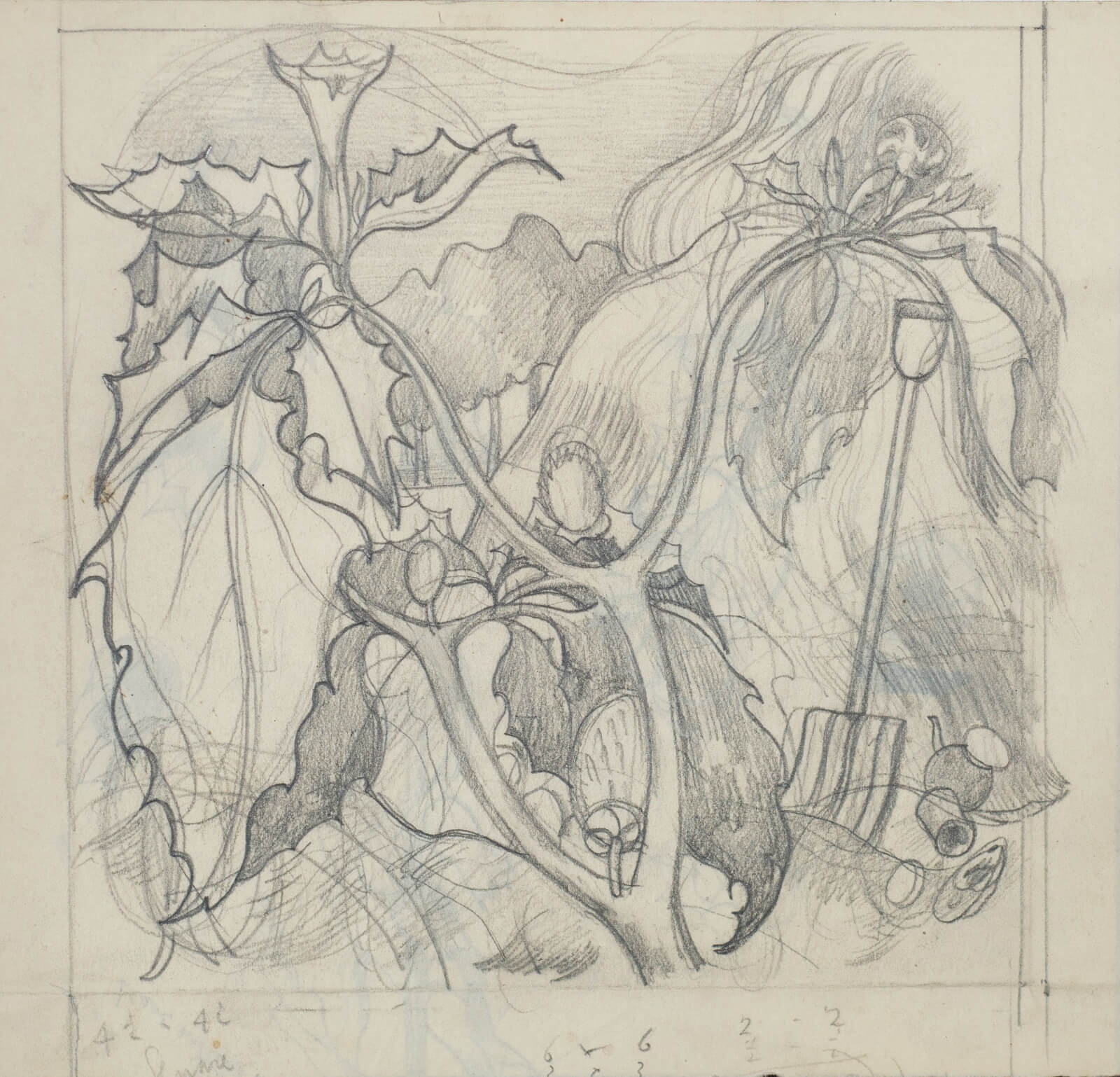 John Nash was a keen plantsman. a passion he shared  which Charles Mahoney, Edward Bawden, Geoffrey Rhoades, and Evelyn Dunbar.  This group regularly swapped cuttings with each other and cultivated their favoured plants in their gardens and recorded them in paintings and drawings.  Illustrations were produced for books – Mahoney and Dunbar had published Gardeners’ Choice in 1937.  English Garden Flowers, for which this is likely to be a study, illustrated by Nash, was published by Duckworth, London, in 1948.  The inclusion of the disproportionately-sized pitch fork is reminiscent of the garden tool motifs that Mahoney and Dunbar enjoyed adding to the more playful of their line illustrations.
