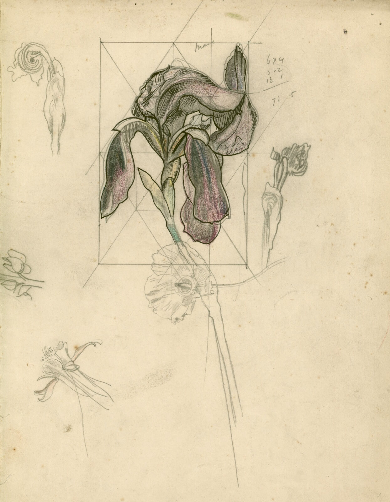 Studies of a poppy, irises and a fox glove (Digitalis)