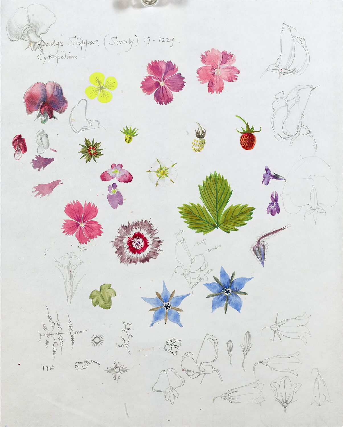 Study of cottage garden flowers, Borage, dianthus, geranium, violet and wild strawberry