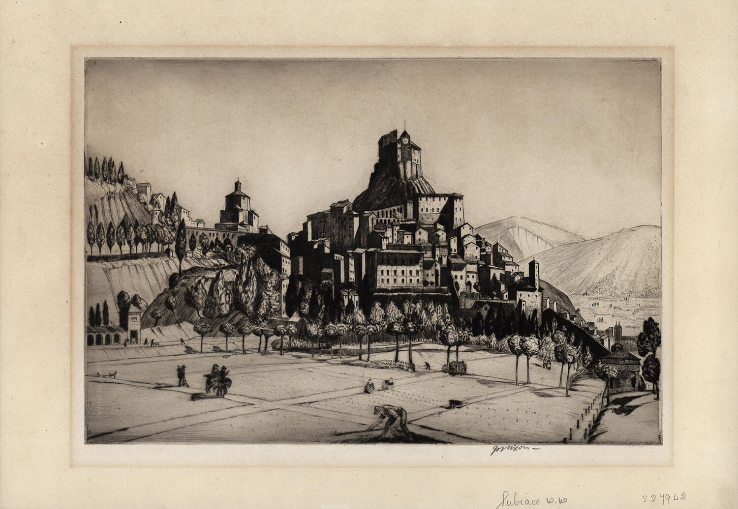 Born in Stoke-on-Trent, Nixon studied at the Slade and at South Kensington and, in 1915, was successful at the RA whilst still a student. He painted in oil and watercolour, principally landscape and topographical scenes, but he is best known for his etchings, drypoints and line engravings, which he started producing from 1913. He was elected ARE in 1923 and, that year, he won the first competition for the newly endowed scholarship of engraving at the British School in Rome. It was while in Italy that he produced An Italian Festa, the huge plate that first brought him to the public’s attention. However, the satirical, almost grotesque, nature of this etching was not his only style and English genre subjects form the majority of his work. Nevertheless, his appointment as assistant to Malcolm Osborne in the Engraving School at the Royal College of Art, South Kensington “came as a shock to the old-fashioned collector and connoisseur but the soundness of his technique and his mastery of etching processes, as well as the salutary influence he exercised in diverting his pupils from too slavish a pursuit of the landscape tradition, more than justifed his appointment.”