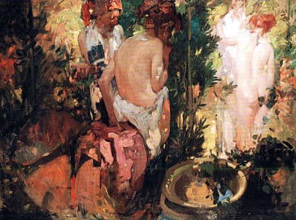 The oil is based on the Old Testament story where Susanna was surprised by two elders when bathing.She repelled their advances and they retaliated by denouncing her for adultery. Daniel, however, exposed their deceit and they were subsequently stoned to death. The subject was popular amongst 17th-century painters, in particular Rubens and Jordaens, whose work Brangwyn admired.