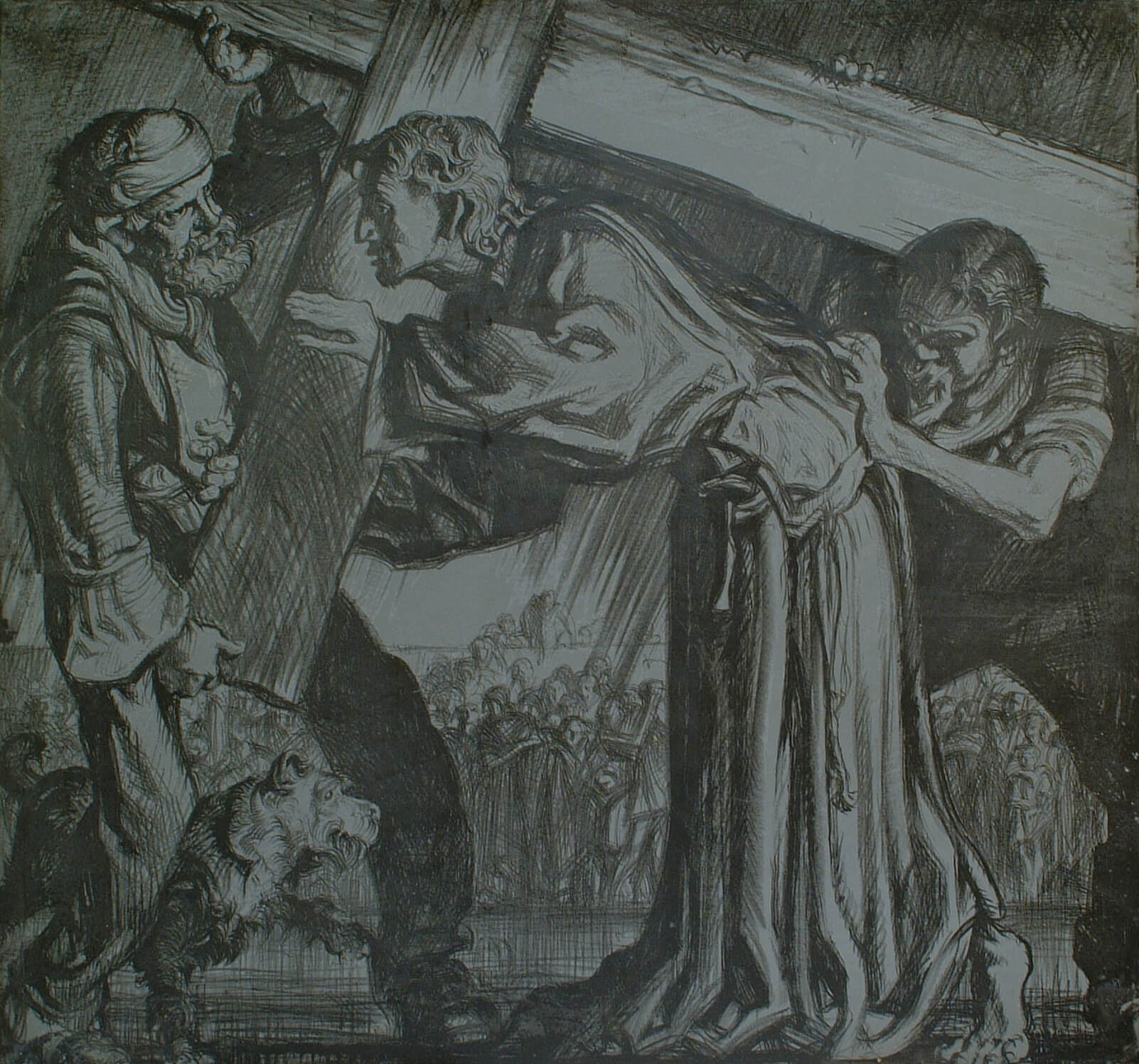 Brangwyn frequently included himself in his compositions: here he is seen supporting Christ and taking the weight of the cross on his back. And for good measure, on left hand side, Brangwyn has included his dog Roger.