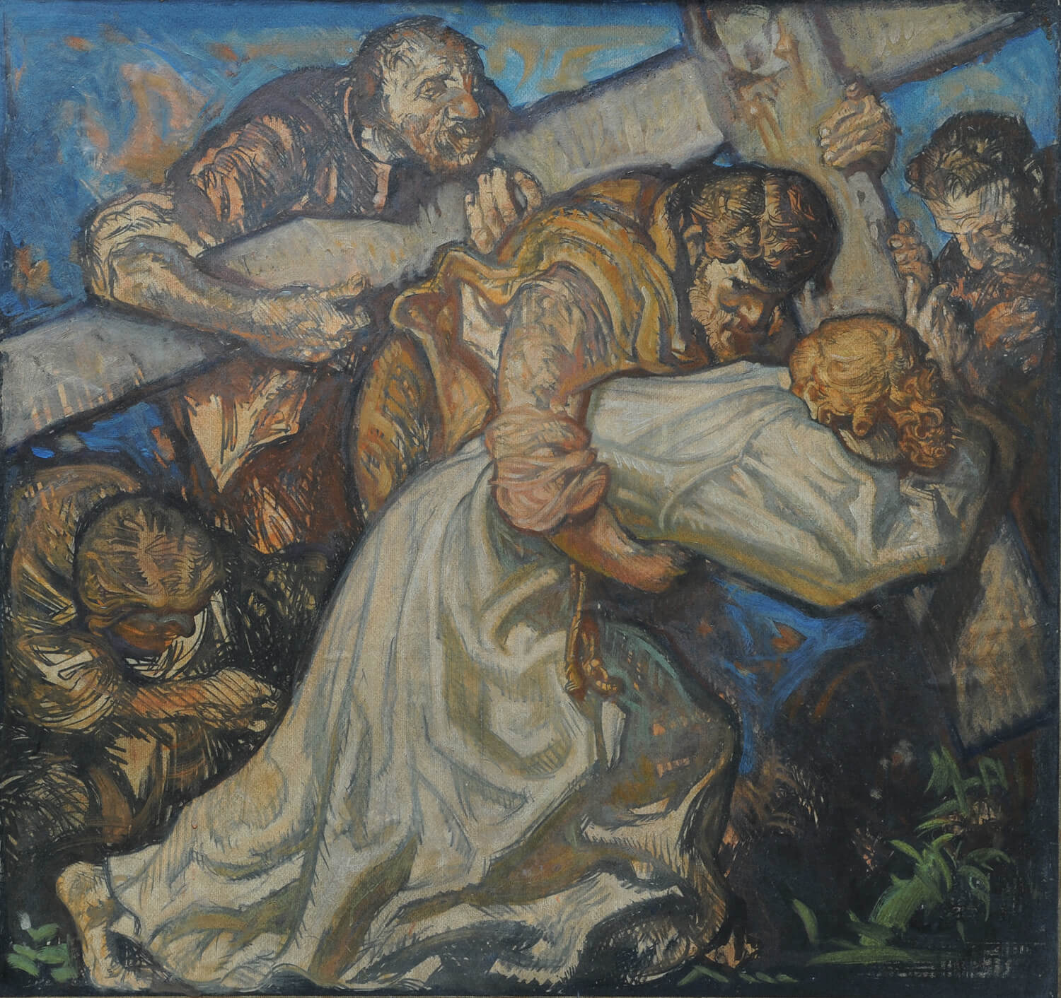 The Stations of the Cross follow the tradition of the Flemish painters with whose work Brangwyn would have been familiar having been born in Bruges. The clothing is contemporary which gives the work immediacy, suggesting that the tragedy of the Calvary is never-ending. One is drawn into the story by the strength and proximity of the characters the viewer is made to feel the tragedy as if he were an eye-witness. As Chesterton points out, every face is different; and every face is vigorous, with an ugly energy that is more attractive than vulgar beauty. The man holding the cross in the 5th Station has almost simian features, the praying girl and toddler in the 8th catch our heart-strings, Christ’s mother in the 14th is composed and we admire her restrained pain whilst in the 13th Station Brangwyn himself experiences the weight and enormity of what has occurred. In direct contrast to the bustling crowd is the pale, spiritual, enigmatic figure of Christ, who, as Chesterton points out, is thereby isolated, it does really make the central figure distinguished, in the exact sense of distinct.