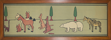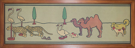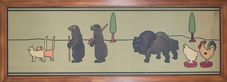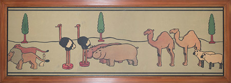 Around 1900 John Hassall produced a series of lithographic friezes for childrens nursery’s which were retailed by Liberty’s. Printed by Jellico and Co. to be fixed directly to the wall as if painted murals, very few examples survive. This set was acquired from the artist’s daughter in the 1970’s. Another series of designs of Children pushing toys around a Nursery is in the collection of the V&A. These designs were part of a wider collaboration between Cecil Aldin and John Hassall – Art for the Nursery – aimed at making the appearance of children’s rooms more attractive.