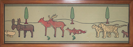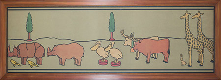 John Hassall also produced nursery friezes showing ‘Old King Cole…l’, ‘Hark, Hark! The Dogs do Bark….’ ‘Tom Tom the Piper’s Son….’ and a series of three upright panels called ‘Morning, Noon and Night, as well as a seven panel set of children pushing toys in a procession, the original designs of which are now in the collection of the V&A.