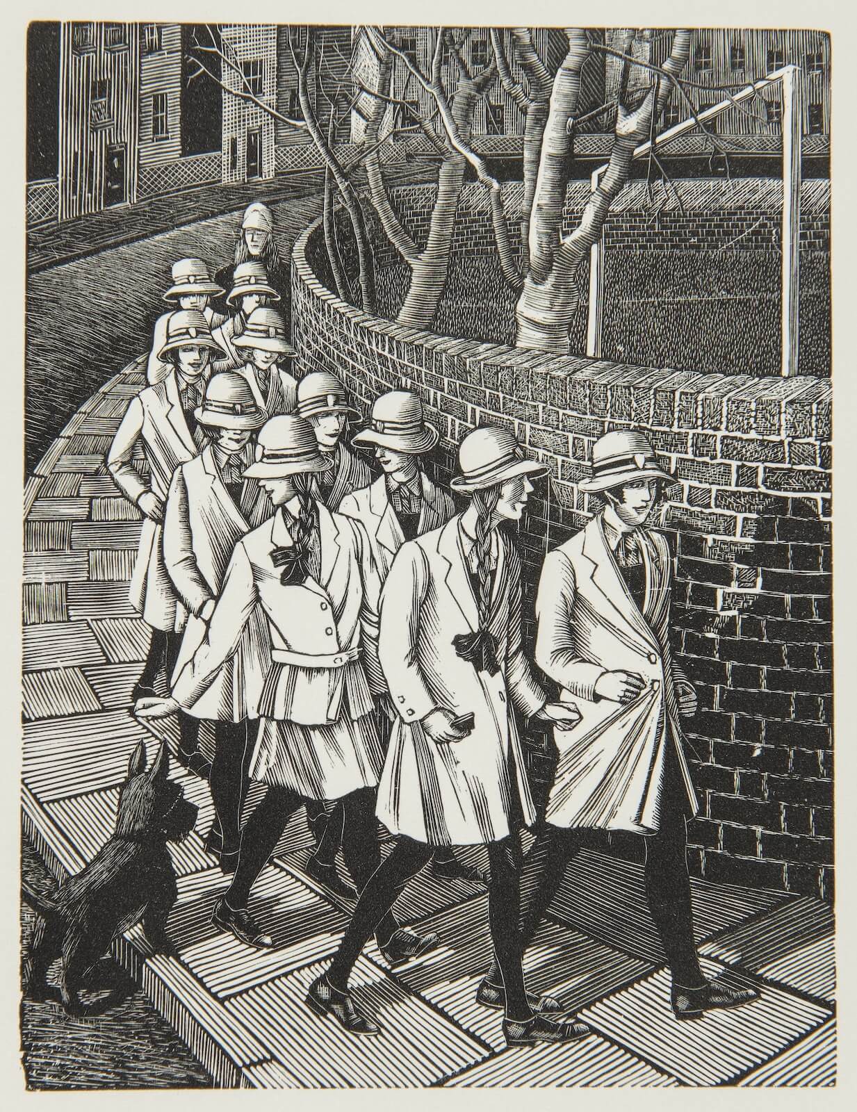 In 1925, at the age of 17, Tirzah Garwood enrolled at Eastbourne School of Art, where, under the instruction of her young tutor, Eric Ravilious, (whom she would marry five years later), she excelled in wood engraving. Her satirical scenes of bourgeois life in 1920’s Britain explored themes such as bathers on Eastbourne beach, window cleaners and plump ladies shopping in Kensington. By 1927, she was already exhibiting and attracting attention for her work, and received prestigious commissions from the BBC and the Curwen Press. The Crocodile and The Dog Show were commissioned in 1929 by Oliver Simon for a projected but never completed calendar to have been published by the Curwen Press. Both engravings, however, were shown at the English Wood Engraving Society’s 1929 exhibition to critical acclaim. The Queen (25th December 1929) compared the puckish humour’ of Garwood’s work to that of Honoré-Victorin Daumier, describing The Dog Show as wicked’ and The Crocodile as that amusing bit of observation’, while Apollo (January 1930) wrote, Miss Tirzah Garwood is, as one expects it of her by now, intensely amusing, especially in The Dog Show’.